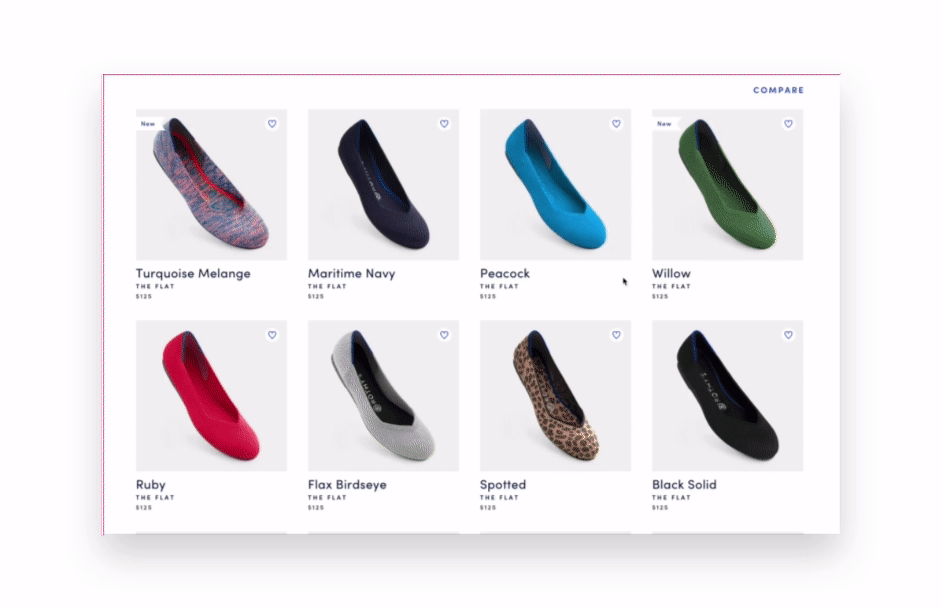 When looking for ideas out in the wild, Rothy’s came to mind. I had just been shopping for shoes and remembered this pop-out experience from their website. As a team (product, design, development), we gathered examples like this and brought them together for review.